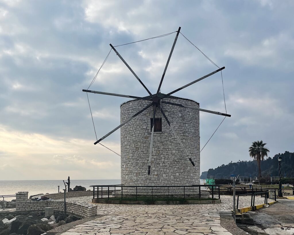 At the end of Garitsa, there is the old windmill Anemomylos and a small narrow path to the lighthouse.