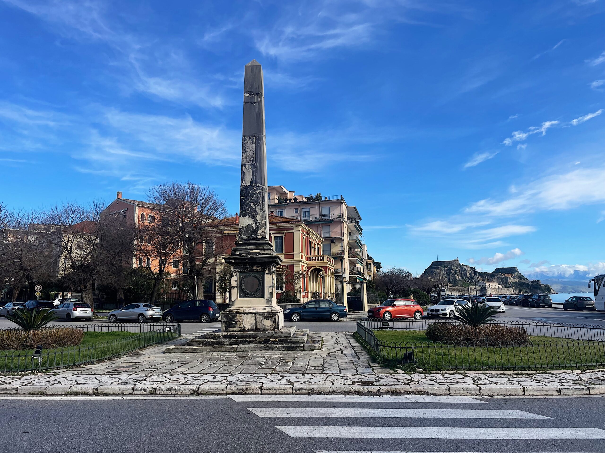 This symbolic trifacial column is dedicated to Howard Douglas, who was Lord High Commissioner of Corfu and the Ionian Islands in 1841–1845 and played an important role in developing the infrastructure of the island.